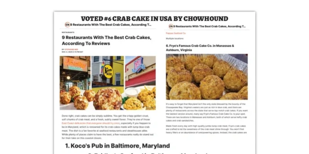 Ranked #6 Crab Cake in the USA by Chowhound! To read full article click here https://www.chowhound.com/2013336/restaurants-best-crab-cakes-according-reviews/